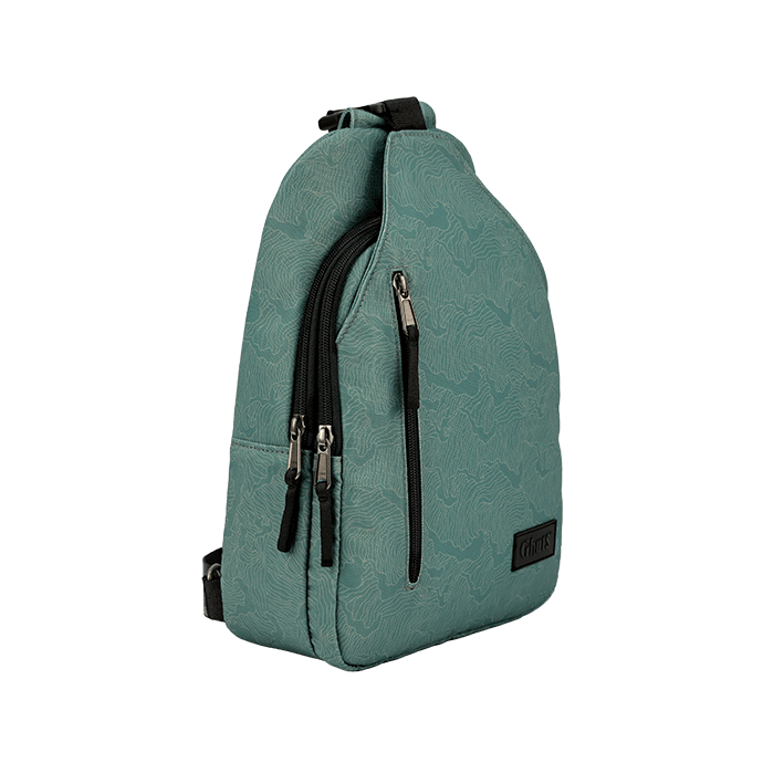 Crossbody bag with two main zippered compartments and an interior pocket.