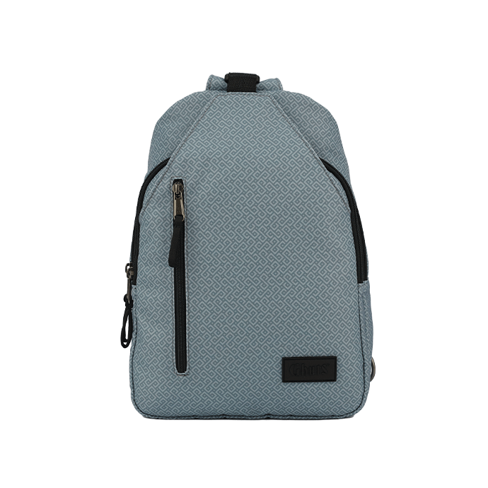 Crossbody bag with two main zippered compartments and an interior pocket.