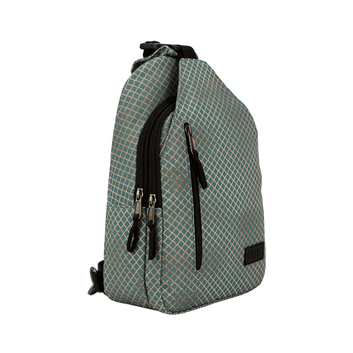 Crossbody bag with two main zippered compartments and an interior pocket.
