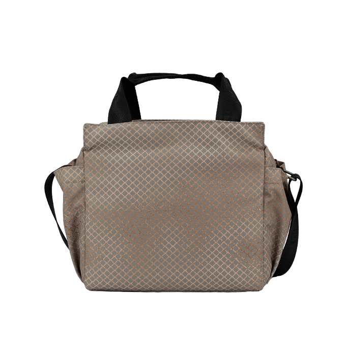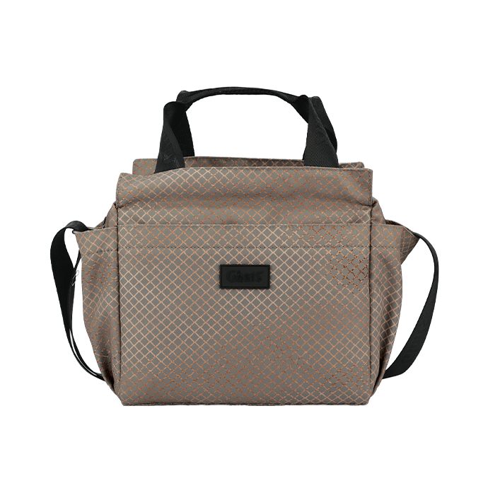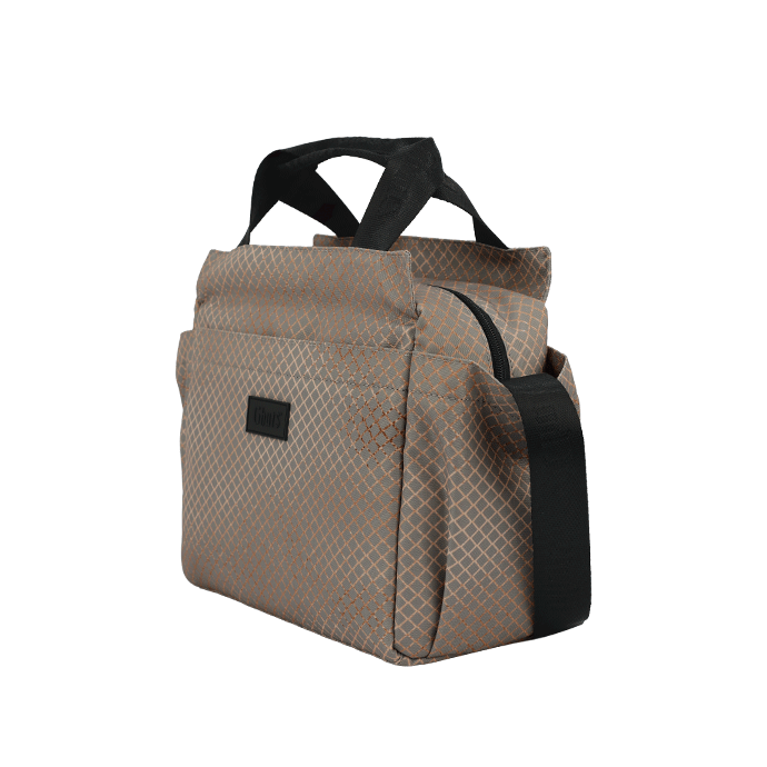 Lunch bag with thermal lining. Top handles and adjustable strap made of satin webbing.