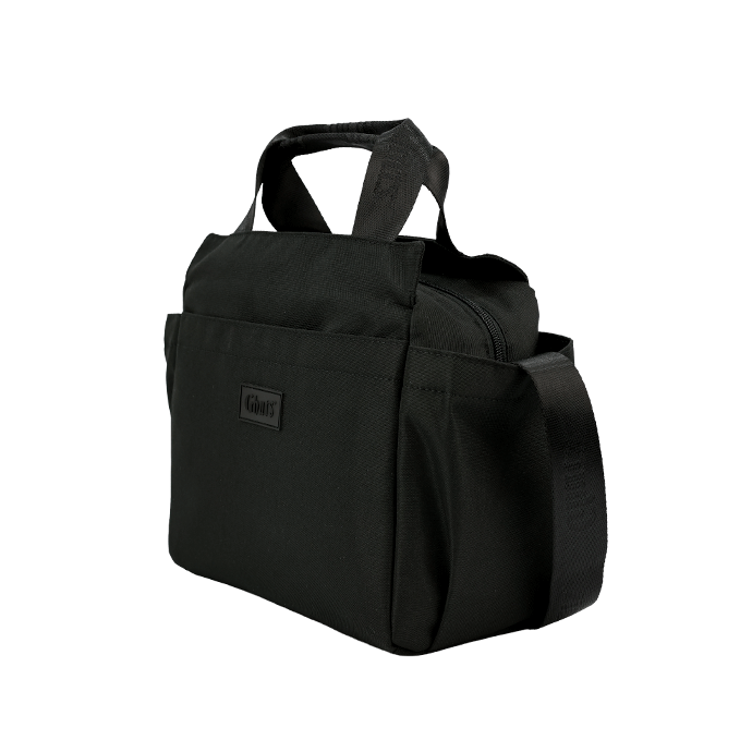 Fiambrera con interior térmico. Asas de mano y correa ajustable de cinta satinada.