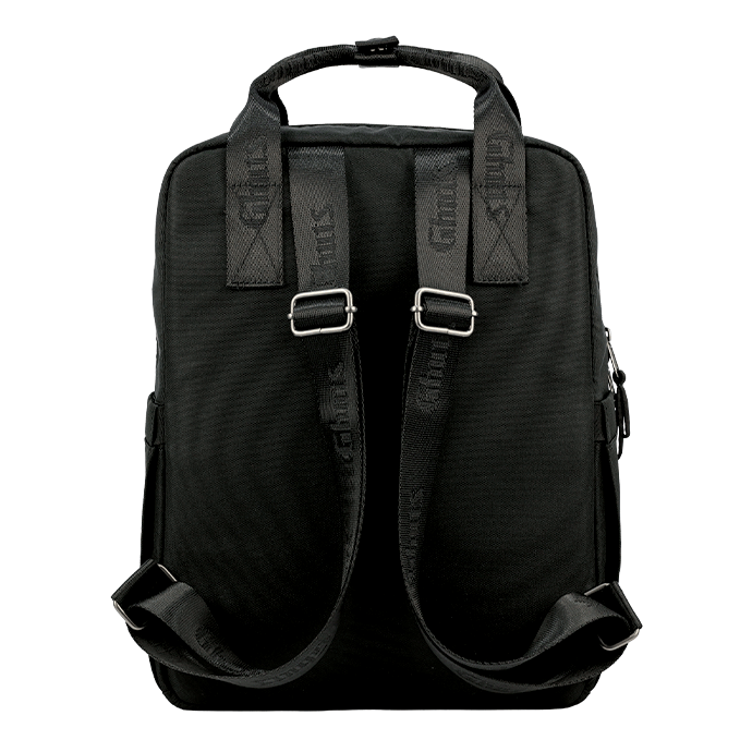 Bolsillo frontal con cremallera y bolsillos exteriores laterales. Asa de mano y correas ajustables de cinta satinada.