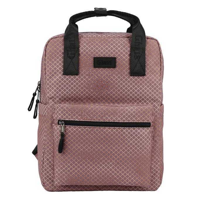 Bolsillo frontal con cremallera y bolsillos exteriores laterales. Asa de mano y correas ajustables de cinta satinada.