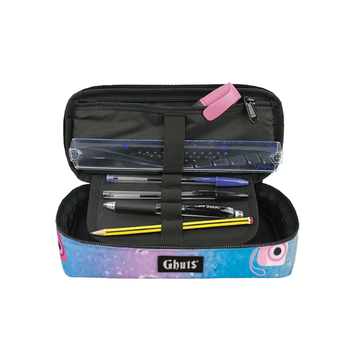 Con soporte para bolígrafos y otros materiales y bolsillo con cremallera interior.