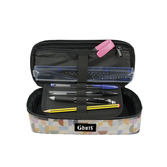 Con soporte para bolígrafos y otros materiales y bolsillo con cremallera interior.