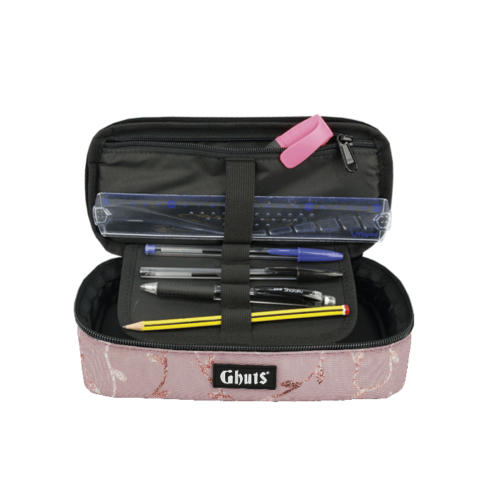 Con soporte para bolígrafos y otros materiales y bolsillo con cremallera interior.