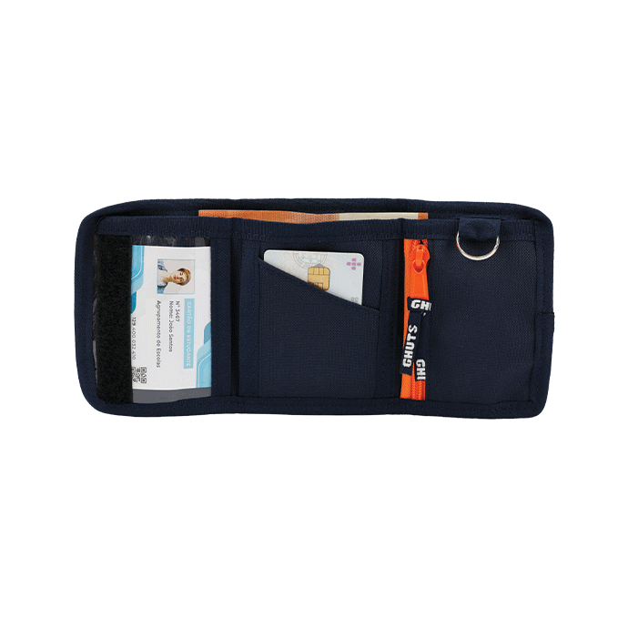Com compartimento para cartões e passe escolar, porta-moedas e porta notas.