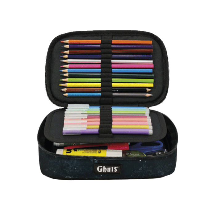 Com suporte para canetas e outros materiais.