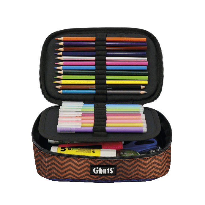 Com suporte para canetas e outros materiais.