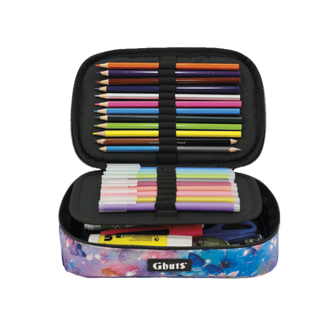 Com suporte para canetas e outros materiais.